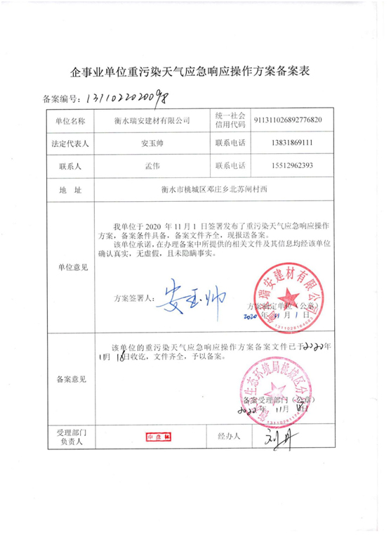 2020年11月1日公司通過了重污染天氣應(yīng)急響應(yīng)操作方案,11月18日衡水市生態(tài)環(huán)境局桃城區(qū)分局通過備案,備案表如下: