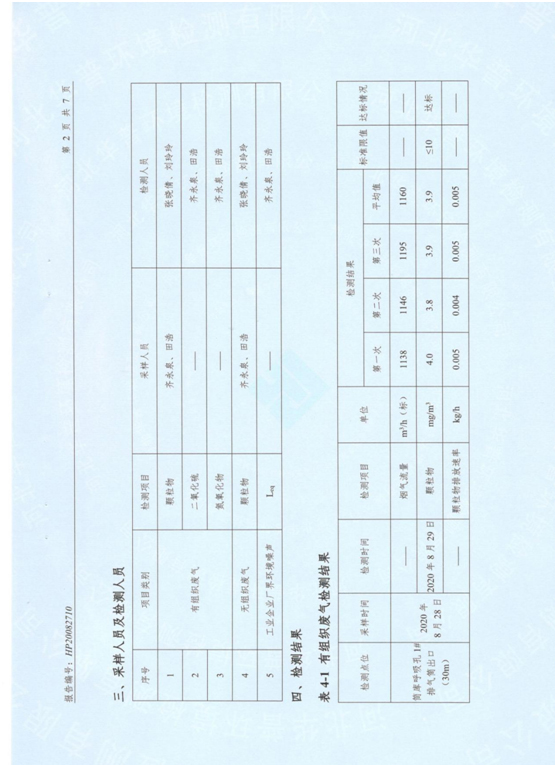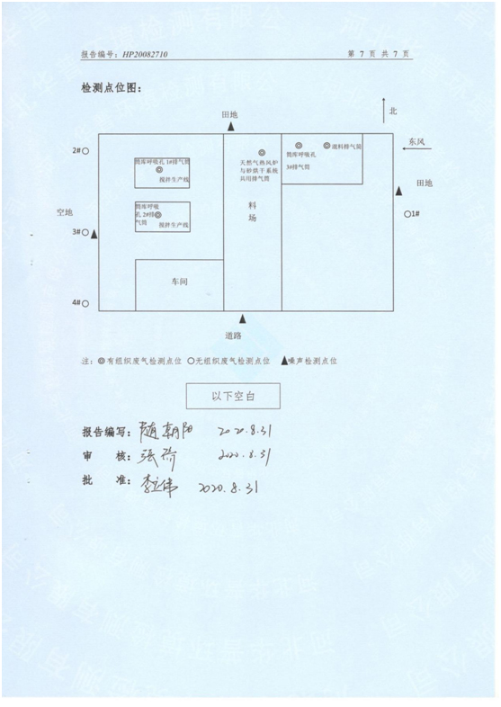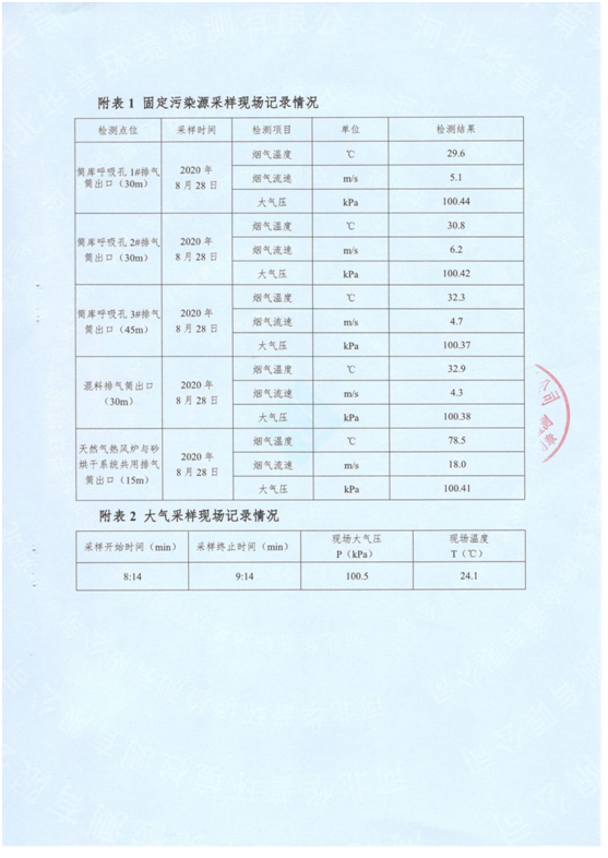 3、排放口數(shù)量和分布情況:共5個排放口,分別是筒庫呼吸孔1#排氣筒出口、筒庫呼吸孔2#排氣筒出口、筒庫呼吸孔3#排氣筒出口、混料排氣筒出口、天然氣熱風(fēng)爐與砂烘干系統(tǒng)共用排氣筒出口。